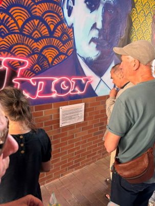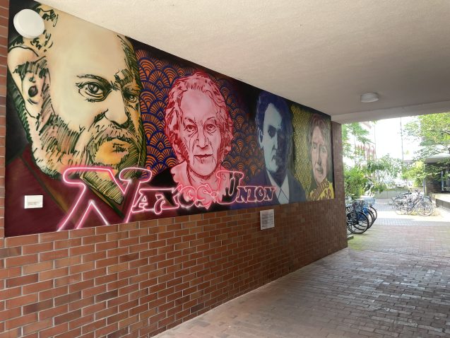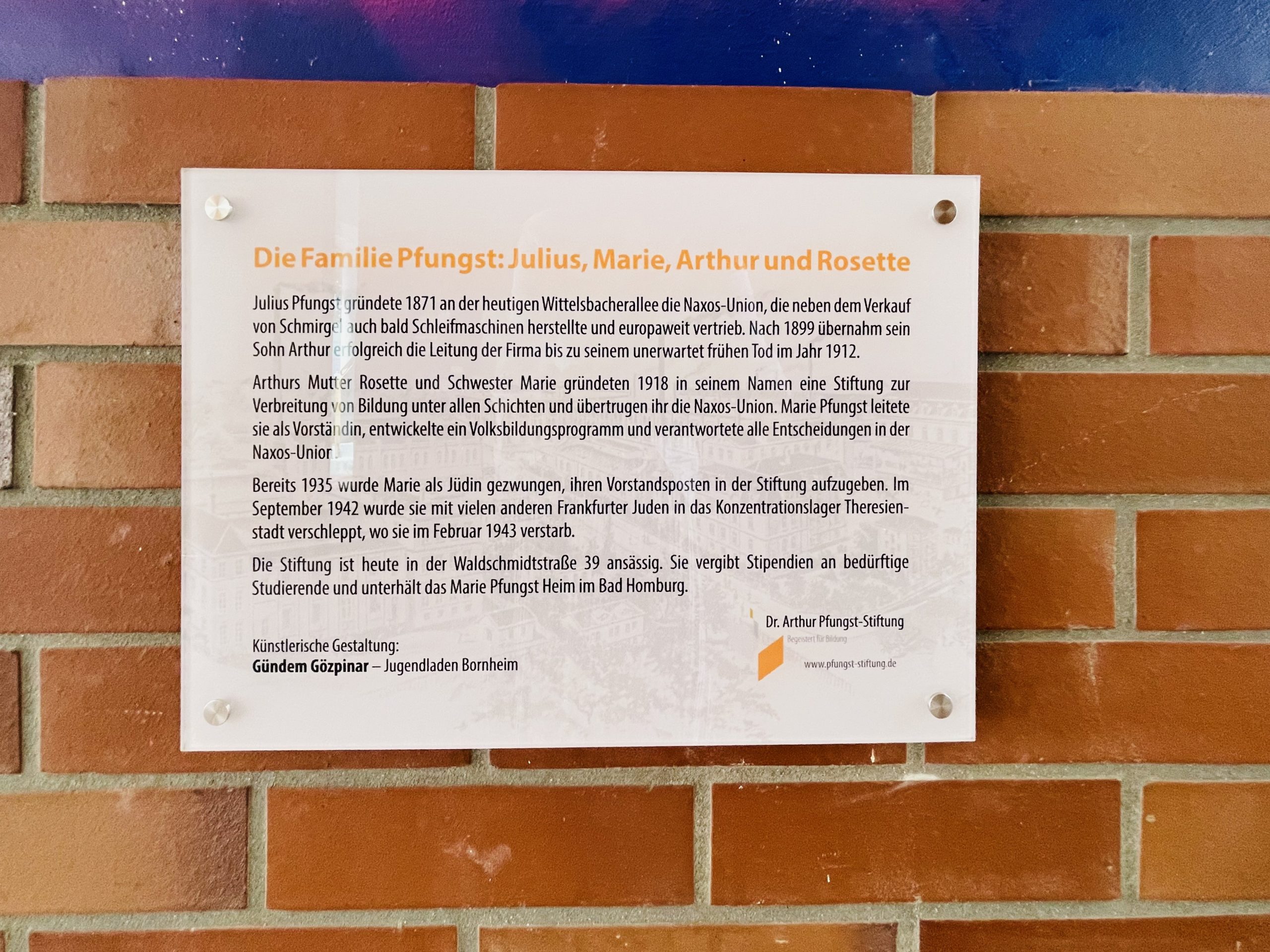 Ein neues Wandbild schmückt seit diesem Sommer den Durchgang des Hauses der Frankfurter Wittelsbacherallee 27, der zum ehemaligen Naxos-Gelände führt. Das Graffiti erinnert an das Wirken der Familie Pfungst und die Naxos-Union, die der jüdische Unternehmer Julius Pfungst 1871 gründete. Im Rahmen eines Sommerfestes ist das Bild nun offiziell am 25. Juli 2024 eingeweiht worden. Entworfen und ausgeführt hat es Gündem Gözpinar. Er arbeitet beim Jugendladen Bornheim, der mit seinem künstlerischen Schwerpunkt im denkmalgeschützten Fabrikbau der ehemaligen Naxos-Union seine Räume hat. Eine Infotafel unter dem Graffiti klärt über das Leben und Engagement der jüdischen Familie Pfungst auf.