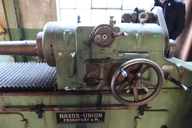 Wir sehen uns in unserer kulturellen Arbeit verpflichtet, auch die Geschichte des Ortes und der Firma NAXOS-UNION selbst sichtbar zu machen. Die Schleifmaschine an ihrem neuen prominenten Standort im Foyer ist weniger industrieromantische Dekoration, sondern vielmehr ein authentisches Relikt der industriellen Vergangenheit des Ortes, das exemplarisch das Produktportfolio der NAXOS-UNION veranschaulicht.