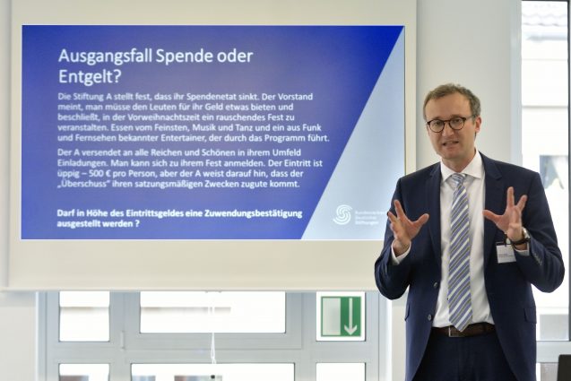 B) Oliver Rohn, Justiziar beim Bundesverband Deutscher Stiftungen, zeigte die „Grenze zwischen Fundraising und Sponsoring“ Anhand von zahlreichen Beispielen veranschaulichte er, wann man von einer Spende und wann von Sponsoring spricht und das eine solche Unterscheidung nicht immer ganz einfach ist.
