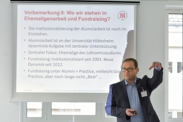 C) „Bildung stiften!“ – Für ihre Fundraisingkampagne erhielt die Stiftung Universität Hildesheim 2018 den Deutschen Hochschulfundraisingpreis des Deutschen Hochschulverbandes (DHV). Markus F. Langer, Leiter Friend- & Fundraising der Stiftung Universität Hildesheim, stellte die Fundraisingstrategie der niedersächsischen Stiftungsuniversität Hildesheim vor und zeigte Beispiele erfolgreicher Netzwerkarbeit auf. Langer betonte, dass vor allem Vertrauen der zentrale Faktor für erfolgreiches Fundraising sei. Friendraising gehe vor Fundraising.