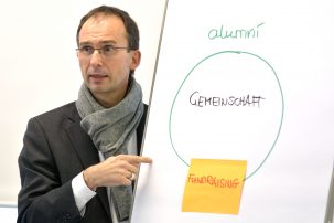 D) „Kann man Alumni über ein Engagement-Center besser binden und öffnet dies die Türen zu späteren Großspenden?“ Dazu referierte Ehrenfried Conta Gromberg, Geschäftsführer der Spendwerk GmbH. Er stellte vier Alumni-Strategien vor, unter anderem das Engagement-Center, durch das Alumni in die Stiftungsarbeit eingebunden werden können, zum Beispiel bei Kampagnen oder anderen öffentlichkeitswirksamen Aktivitäten. Dieses freiwillige Engagement schafft Bindung und Identifikation, auf das man später aufbauen kann.